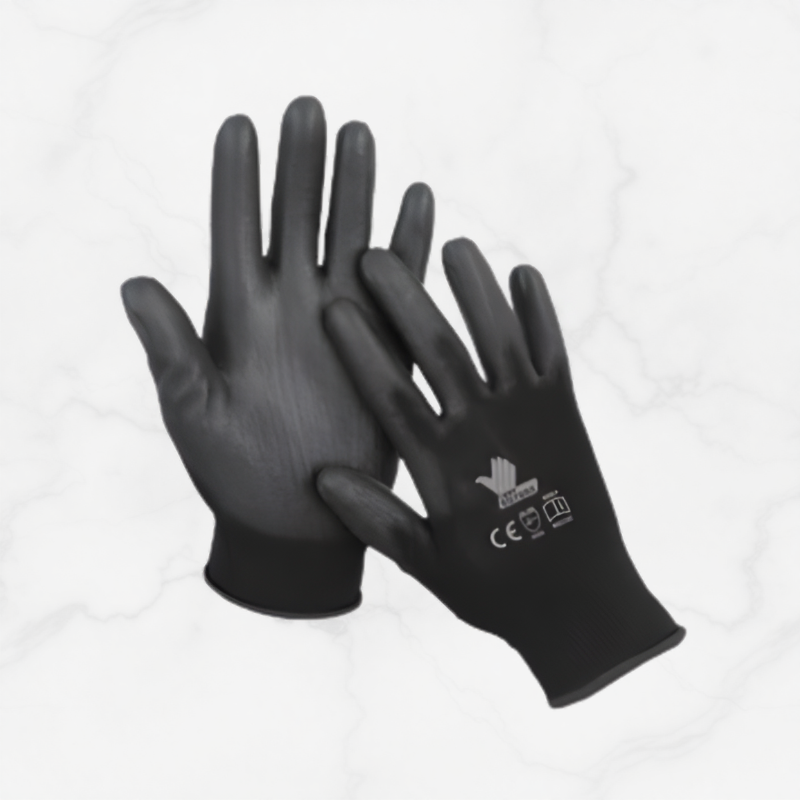 Fabricado en poliéster recubierto en poliuretano calibre 13, Color negro. Puño tejido para un mayor agarre.